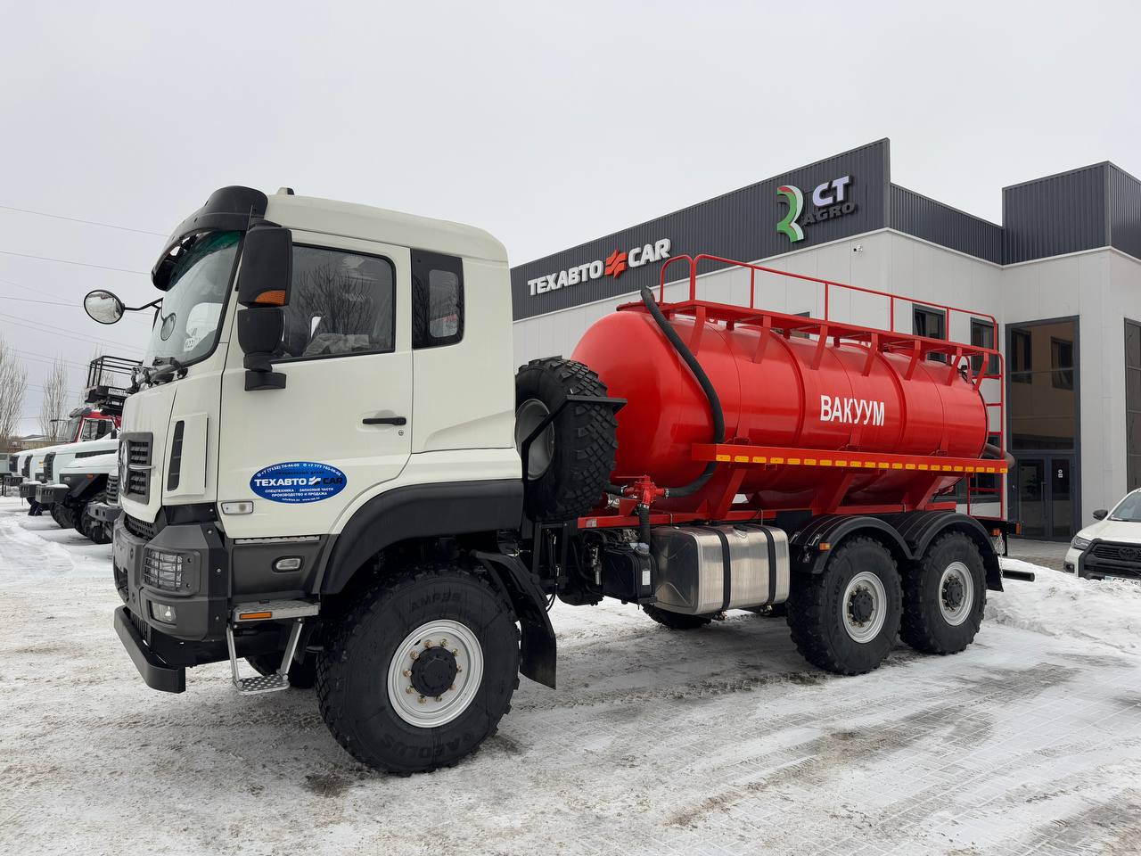 Круглого сечения, из стали 5мм, двумя перегородками волнорезами, верхний люк диаметром 500 мм с клапаном ограничения вакуума, с клапаном ограничения давления; Площадка обслуживания из поперечного листа с лестницей; Два сферических смотровых окна, на заднем днище с подсветкой для контроля заполнения; Первый запорный клапан с шаром, перекрывающий подачу жидкости в цистерну при заполнении; Второй запорный клапан в ресивере; Четырехходовой кран; Мановакуумметр на линии отсоса воздуха из цистерны; Фара прожектор освещения рабочей зоны в задней части цистерны;
